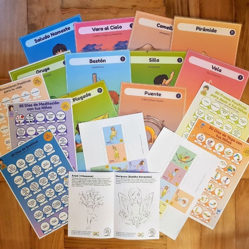 Un gran conjunto de materiales didácticos para enseñar yoga a los niños, incluyendo tarjetas bellamente ilustradas con posturas de yoga fáciles, así como páginas de colorear, cubos y actividades de mindfulness.